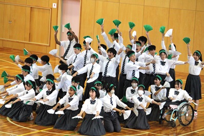 本年度も、体育祭と切り離して体育館での開催です。昨年度から、全校共通のテーマを設定し、各クラスは共通テーマのもと演技内容や演技構成など工夫しました。ちなみに、今年のテーマは「勢(いきおい)」です。