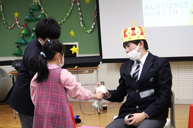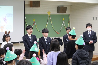 その後、シルエットクイズや風船バレー、大玉転がしなど3校の児童生徒で楽しめる内容で盛り上がりました。また、長中生手作りのクリスマスツリーをイメージした三角帽子を小学生に配り、お土産として持ち帰ってもらいました。