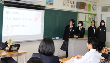 1月29日(木) 2年生が職場体験学習の成果等をまとめ、1年生に向けて発表会を行いました。8教室に分かれ、タブレット端末で準備したプレゼン映像を使いながら、体験先ごとにグループ編成され、各班5分程度の発表でした。次の4点についてまとめられていました。