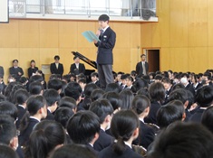 生徒会主催の対面式では、生徒会長から新入生に向けて歓迎のことば、新入生代表生徒から2,3年生にお礼のことばが述べられました。