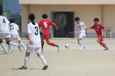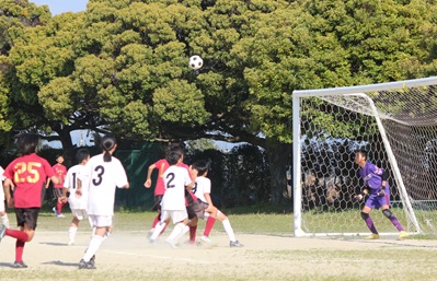 初戦の対戦相手は栄中学校でした。数的に不利な状況でしたが、全員が集中を切らさず、互角の戦いが続きました。0-0で迎えた後半アディショナルタイム、コーナーキックからヘディングシュートを決めて、勝利しました。同時に、決勝トーナメント進出を決めました。